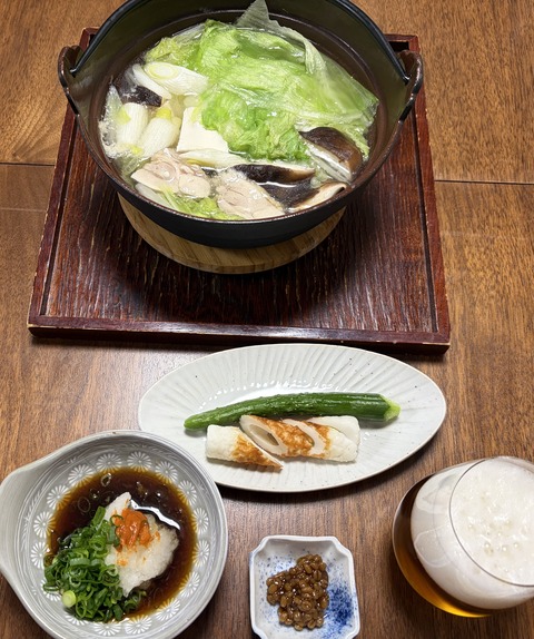 家人が前職の方々とお昼の会食に出かけて夕飯は要らないので私の夕食は冷蔵庫に有るものを寄せ集めてお鍋にしました。冷凍庫の貝柱を解凍してお刺身す···