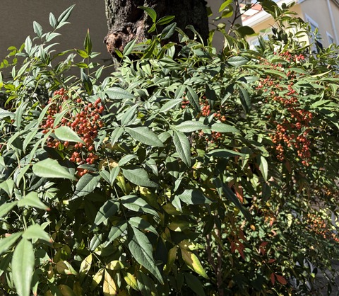 家人がリハビリへ行くのを見送り私はドラッグストアへ行きました。きれいな秋空、南天の実が色づき始めました。今年は咲くのが遅かった金木犀が良い香···