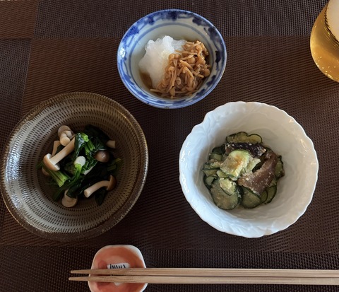今日は寒くてお酒で温まりたい気分なのでおつまみ3種を作りました。きゅうりと干し椎茸旨煮のごま酢和えほうれん草としめじのお浸し自家製えのき茶漬···