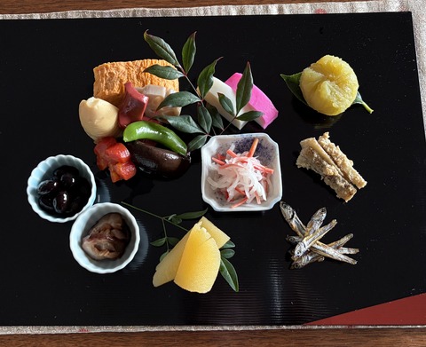 年末息子夫妻が家人のお見舞いに行ってくれたので私は1日お節作りに精を出し少しずつ10種類余り作りました。一人ぼっちのお節ごまめ、数の子、ナマコ···