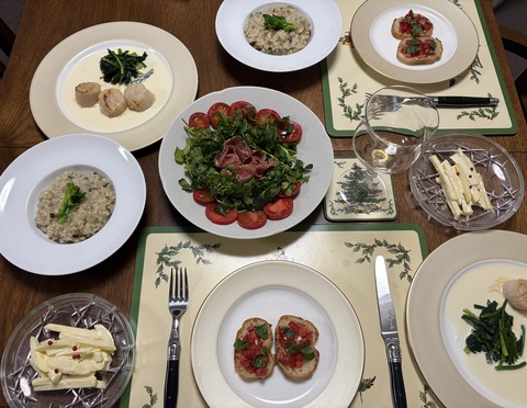 初めて友と二人のクリスマスです。少しだけクリスマスムードの夕食にしました。家にある食材で賄おうとしましたがバジルとバゲットだけ足らず買いに行···
